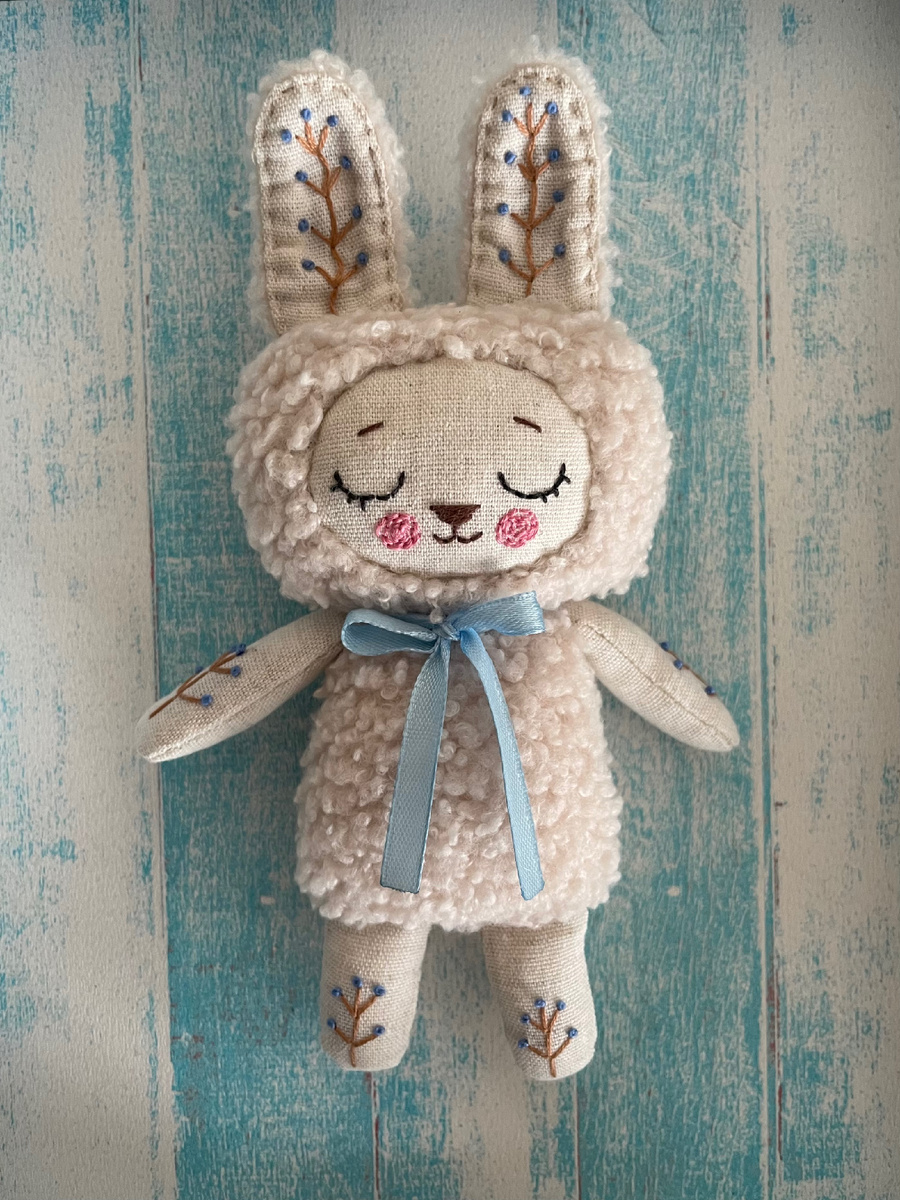 Наношу узор на детали ручек и ножек зайчика. Вышиваю узор в таком же цвете, как на ушах. Сшиваю детали, оставляя отверстия для выворачивания. Обрезаю по контуру, оставляя припуск примерно 0,3 см. После выворачивания, набиваю наполнителем и зашиваю отверстия. Пришиваю лапки и подбираю подходящую ленточку. Зайчик готов 🤍💙 Дрругие игрушку можно посмотреть в моем сообществе в ВК: