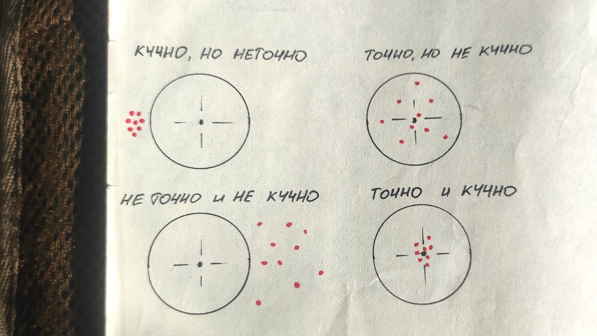Для стоит сказать, что большинство этих людей не понимают никакой разницы между кучностью и точностью. Вот эта картинка лучше любых слов показывает разницу (нужную в интернете не нашёл, поэтому нарисовал от руки).