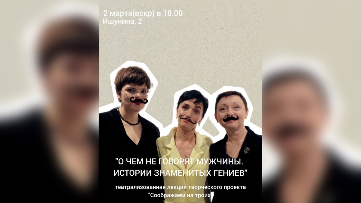 Лекция "О ЧЕМ НЕ ГОВОРЯТ МУЖЧИНЫ. ИСТОРИИ ЗНАМЕНИТЫХ ГЕНИЕВ" В канун главного женского праздника творческий проект «Соображаем на троих» предлагает поговорить о самой неисчерпаемой теме — о мужчинах. Не пугайтесь, никаких сплетен и интриг! Наш интерес исключительно научный! Мы приготовили для вас истории, факты и анекдоты о знаменитых представителях сильного пола. Деятели искусств, меценаты, историки, ученые, правители... У каждого из них была своя муза, своя тайна, своя мечта и свои стремления. Приближаемся к судьбам великих мужей и открываем их по-новому на лекции «О чем не говорят мужчины. Истории знаменитых гениев». Чем занимались российские императоры на досуге, что коллекционировали Чехов, Бунин, Набоков и другие известные писатели, и какие хобби были у знаменитых режиссеров и артистов вы узнаете вместе с нами уже совсем скоро! Ждем вас на нашем предпраздничном вечере и обещаем, что скучать никому не придется! 2 марта (вскр) в 18:00 сбор гостей в 17:30 ул. Ишунина, 2(ФМР) - куль