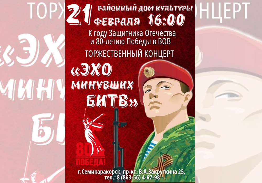 Районный дом культуры приглашает семикаракорцев на торжественный концерт, посвящённый году Защитника Отечества и 80-летию Победы в Великой Отечественной войне «Эхо минувших битв». Вас ждут 21 февраля в 16:00!