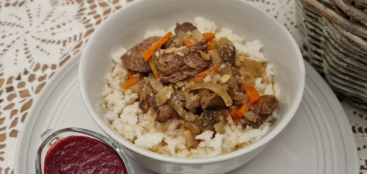 Этот рецепт живёт в нашей семье много лет. Хочу с вами поделиться им накануне 23 Февраля. Думаю, что мужчинам понравится мясо, приготовленное по-карельски. По рецепту используют три вида мяса и подают его с брусничным соусом. Вам понадобится: — говядина – 800 граммов; — баранина – 800 граммов; — свинина – 800 граммов; — лук репчатый (я еще порей использую) – 6-8 головок; — морковь – 2 штуки; — чеснок – 2 головки; — имбирь свежий – 1 соловая ложка с горкой в нарезанном виде; — семя кориандра – 1 столовая ложка; — перец молотый (у меня смесь перцев) – по вкусу; — соль – 1 + 1/3 столовой ложки; — смесь пива с водой (1:1) – 750 миллилитров.; — зелень сушёная, какую любите – по вкусу (я заменила сушёным корнем петрушки); — брусника замороженная - 1 стакан; — сахар-песок – примерно 2 столовые ложки без горки. Возьмите три вида мяса в равных пропорциях. Если не любите баранину, замените её говядиной. Можно использовать и дикое мясо. Желательно брать не перемороженное, а охлаждённое. Это может