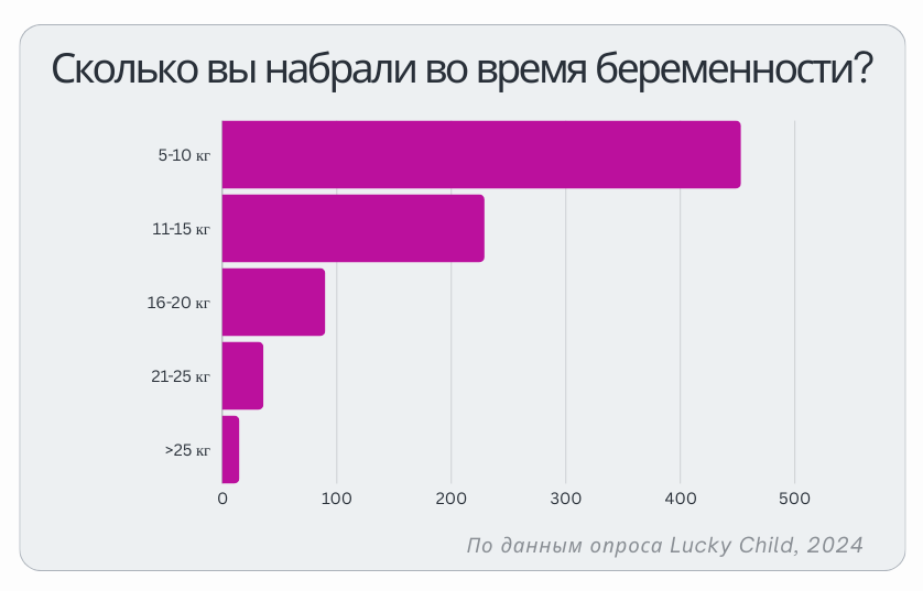 Опрос Lucky Child показывает, что большинство женщин во время беременности остаются в рамках норм. Однако немалая доля беременных набирают излишний вес. Это может быть связано с генетическими особенностями, изменениями метаболизма, малоподвижным образом жизни, неправильным питанием, многоплодной беременностью, а также психологическими факторами и т. д. Читайте другие статьи: