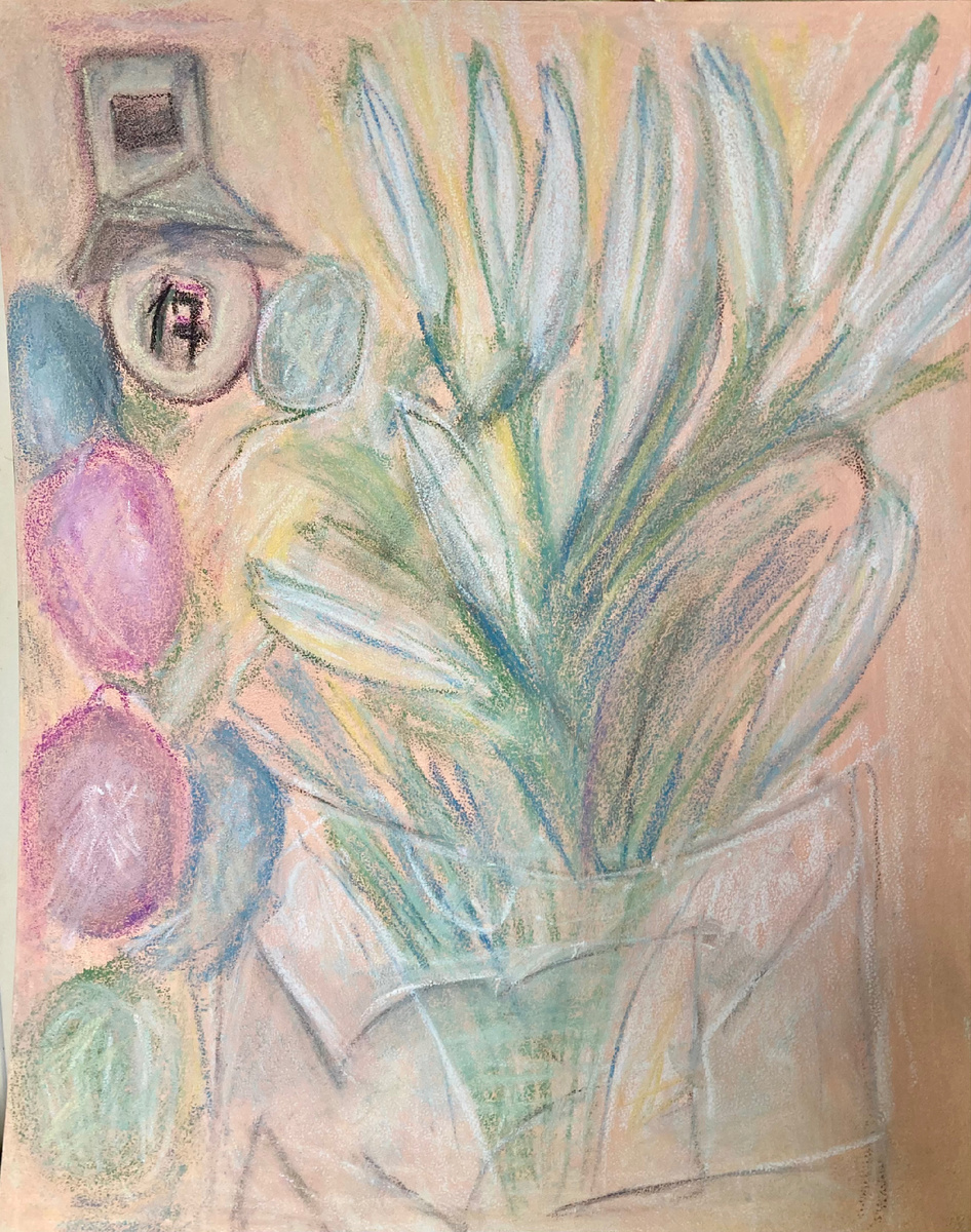 Шарики, белые лилии еще не распустились, все в бутонах, ощущение радости - нарисовала за 20 минут, просто передать эмоции и нежность, свет. Интересно получился целлофан , в котором был букет… Сейчас лилии распустились и можно нарисовать полные цветки, но мне кажется эмоции момента не могут быть переписаны заново или дорисованы, а 17 - это старинный номер дома, я подобрала его, когда на нашей улице снесли старый деревянный дом и сохранила, отчистила и подвесила при входе на кухню, теперь он номер моей кухни))))