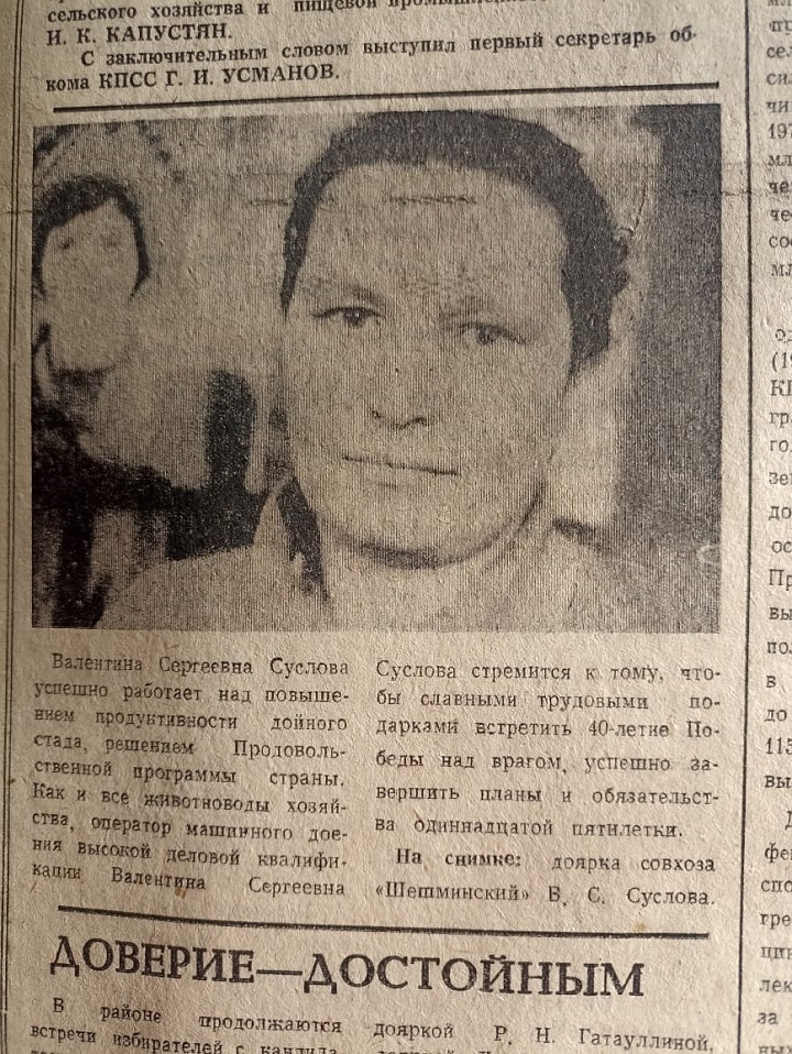О принятых Новошешминским районам социалистических обязательствах на 1985 год, об итогах по животноводству за 1984 год, о ветеранах войны под рубрикой «Навстречу 40-летия Победы» - об этом мы писали 40 лет назад. «Шешминская новь» от 19 февраля 1985 года Продолжаются встречи трудящихся района с кандидатами в депутаты районного Совета народных депутатов. В коллективах колхоза «Татарстан» и совхоза «Красный Октябрь» прошли встречи с председателем колхоза «Татарстан» Р.Г. Лотфуллиным, управляющим РО «Сельхозтехника» Р.А. Фасиковым, председателем исполкома райсовета В.П. Макаровым, секретарем парткома совхоза «Красный Октябрь» С.Я. Ибрагимовой. Новошешминский район принял соцобязательства на 1985 год. Труженики района обязуется получить 20 ц/га зерновых культур, 100 ц/га – картофеля, 100 ц/га – овощей, 500 ц/га – кормовых корнеплодов, 30 ц/га – сена многолетних трав. Продать государству 56 тыс. тонн зерна и 700 тонн картофеля и овощей, 20,6 тыс. тонн молока, 3800 тонн мяса и 53 тонны шерст