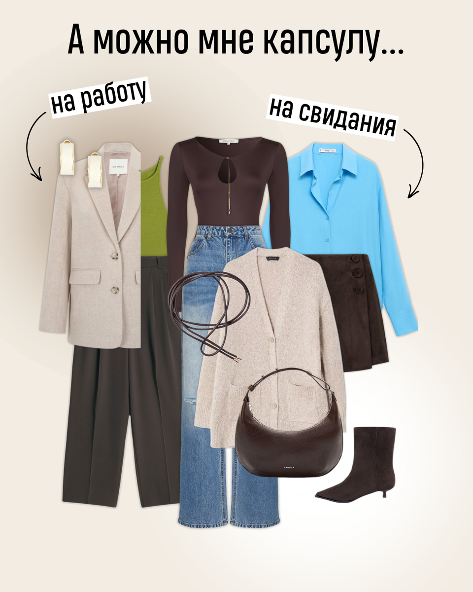 Одна капсула на все случаи жизни?👇🏻 ⠀ Так нам предлагало рекламироваться одно агентство. Можно попробовать натянуть эту сову🦉 на глобус, но реально ли 8-10 вещей могут закрыть все задачи? ⠀ В целом, могут, если у вас нет строго дресс-кода, вы любите смарт кэжуал и вообще предпочитаете минимализм. Под эту задачу мы составили капсулу, как в галерее: она может быть более или менее цветной или сложной по крою. И это хороший старт для развития гардероба. ⠀ Чем дальше разные сферы вашей жизни друг от друга, чем более по-разному вы хотите выглядеть на свидании и в офисе, тем более разные вещи и капсулы вам нужны. ⠀ Для каждой подборки лучше ставить, максимум, 2️⃣ не очень далекие друг от друга задачи. ⠀ Например, офис с неформальным дресс-кодом + детская площадка без спортивных подвигов – это ок💼➕👟 ⠀ Офис + свидание – тоже реалистично💼➕❤️ ⠀ Офис + вечер – да, но нужно сделать акцент на аксессуары💼➕🪩 ⠀ Чем больше сфер, тем хуже компромиссы. ⠀ Выход: определиться с приоритетами