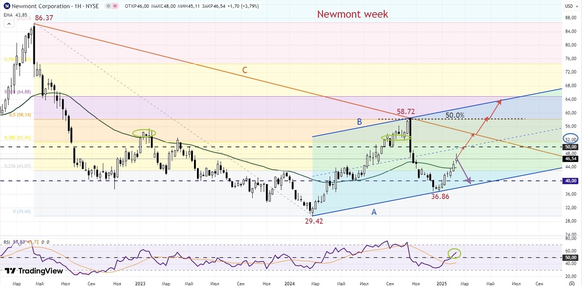 На недельном графике Newmont Goldcorp видно, что с лета 2022г по март 2024г акции компании упали почти в 3 раза, достигнув 6-летнего минимума на отметке 29.42. Но во 2-м и 3-м кварталах прошлого года бумага резко взлетела, достигнув двухлетнего максимума на отметке 58.72. Отчет за 3 квартал 2024г сильно разочаровал рынок и акции NEM снова обвалились более чем на 30%, протестировав круглую цифру 40.00. Но с началом 2025г настроения инвесторов улучшились и бумага снова пошла вверх. На прошлой неделе котировки превысили отметку 46.00, а осциллятор RSI поднялся выше средней линии 50.0, что говорит о потенциале дальнейшего роста. Если отчет за 4 квартал порадует инвесторов, то акции NEM могут не только прорваться выше сильного уровня 50.00, но и дойти до линии сопротивления «С» (52.00) и далее к максимумам 2024г. Если же отчет окажется слабым, то бумага может упасть к линии поддержки «А» в район круглой цифры 40.00.