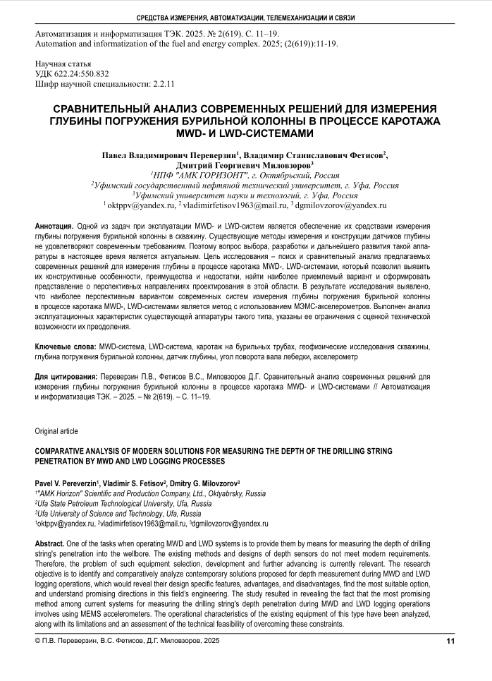 СРАВНИТЕЛЬНЫЙ АНАЛИЗ СОВРЕМЕННЫХ РЕШЕНИЙ ДЛЯ ИЗМЕРЕНИЯ ГЛУБИНЫ ПОГРУЖЕНИЯ БУРИЛЬНОЙ КОЛОННЫ В ПРОЦЕССЕ КАРОТАЖА MWD- И LWD-СИСТЕМАМИ