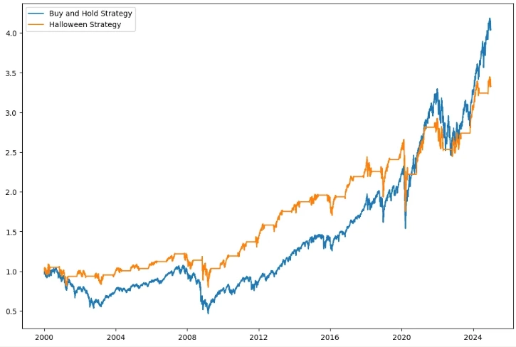 Перед тем как вы погрузитесь в изучение статьи, обратите внимание на тот факт что всё упомянутое в ней не является финансовой рекомендацией для принятие более взвешенного решения просьба провести свое собственное исследование. ________________________________________________________________________ Первый эффект, который я исследовал, — это эффект Хэллоуина. Он также известен как феномен «продавай в мае и уходи». Авторы обнаружили, что этот эффект статистически значим для S&P 500. Авторы так описывают эффект Хэллоуина: «Эффект Хэллоуина» предполагает, что доходность фондового рынка в период с ноября по апрель выше, чем в остальные месяцы года. Эта сезонная аномалия предполагает, что инвесторы должны покупать акции в конце октября и продавать их в начале мая, фактически «продавая в мае и уходя». Обоснование этой стратегии основано на исторических данных, показывающих более высокую эффективность в зимние месяцы по сравнению с летними». Довольно простая идея, которую несложно реализовать.