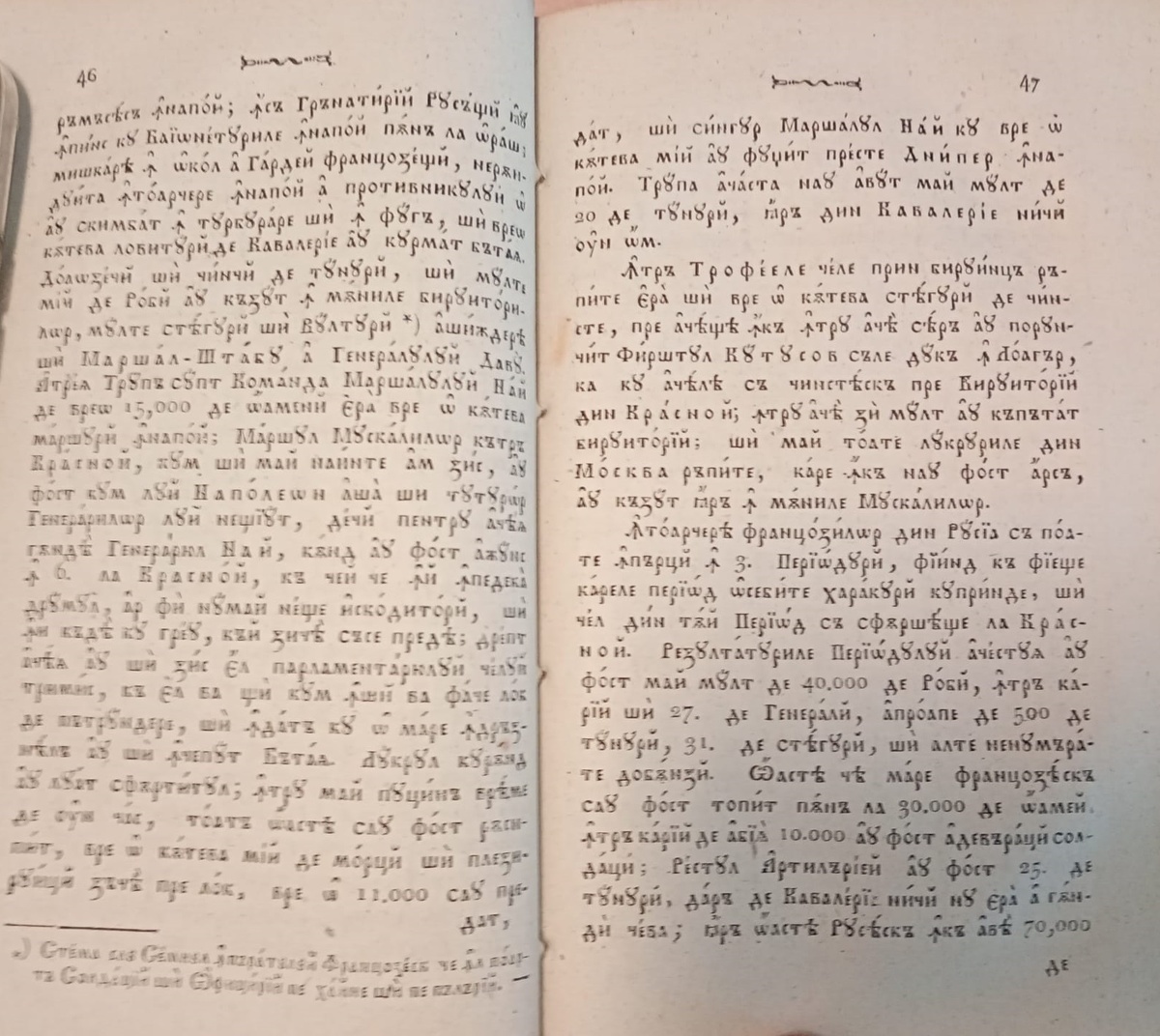 Rămăsese înnapoi; însă Grănatirii Rusești iau înpins cu Baioneturile îmmapoi până la oraș; mișcarea în ocol a Gardei franțozești, nerânduită întoarcere înnapoi a protivnicului o au schimbat în turburare și în fugă, și vreo câteva lovituri de Cavalerie au curmat bătaia. Douăzeci și cinci de tunuri, și multe mii de Robi au căzut în mâinile biruitorilor, multe steaguri și vulturi*) așijderea și Marșal-Ștabu a Gheneralului Davu. A trei trupă supt Comanda Marșalului Nai de vreo 15000 de oameni era vre o câteva marșuri înnapoi; Marșul Muscalilor către Krasnoi, cum și mai nainte am zis, au fost cum lui Napoleon așa și tuturor Generarilor lui neștiut, deci pentru aceea gândea Generariul Nai, când au fost ajuns în 6 la Crasnoi, că cei ce îi înpedeca drumul, ar fi numai nește iscoditori, și îi cădea cu greu, căi zice săse predea; drept aceea au și zis el parlamentariului celui triis, că el va ști cum își va face loc de pătrundere, și îndată cu o mare îndrăzneală au și început Bătaia. Lucrul cu