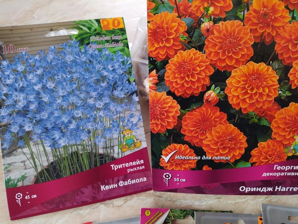 Я покупала разные оранжевые георгины, но вырастало нечто совсем другое. И что выросло из упаковки на верхнем фото — покажу вам в конце… Чтобы сохранить интригу и удержать ваше внимание…