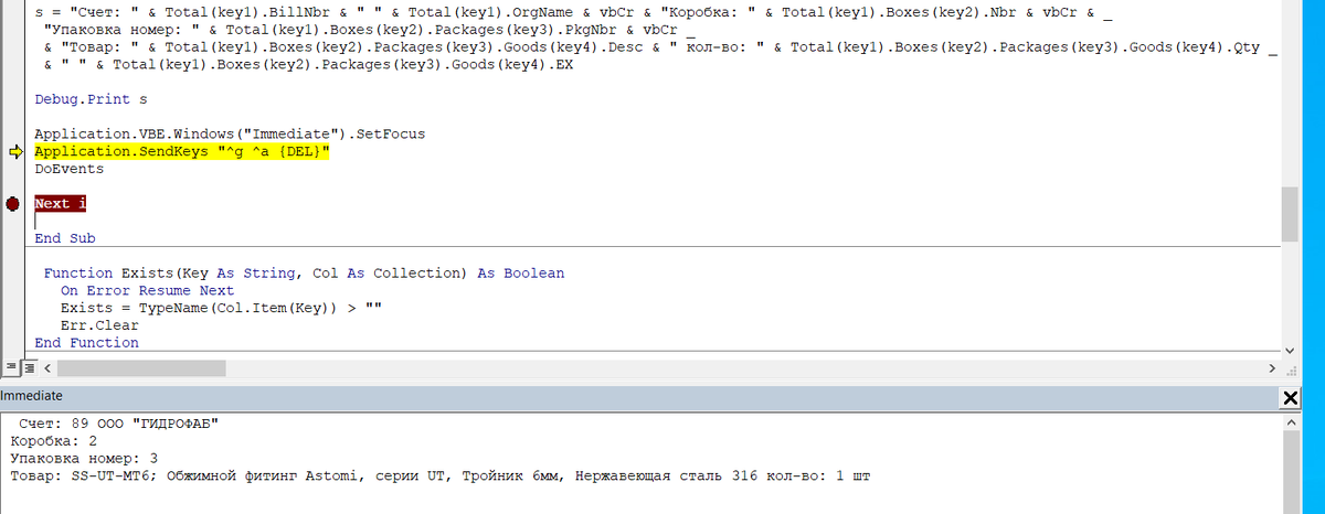 Просто чтобы сохранить и себе не забыть. На заметку разработчику VBA Понадобилось мне тут намедни отлаживать иерархически построенную систему из коллекций пользовательских классов - штука сложная в том смысле, что формирование сложной и многоуровневой коллекции элементов усложняет отладку, но зато такую конструкцию проще развивать. Ну, например. у меня есть объект упаковка. В ней коллекция артикулов, которые в ней находятся, и ее свойства - идентификационный номер упаковки и номер упаковки в коробке. Если понадобится по физическим процессам добавить еще какие-то свойства и как-то их рассчитывать, то просто добавляются свойства в объект, буквально парой строчек, а не переписывается половина кода. Но вот отлаживать такую конструкцию сложно. Надо или изначально каждую строчку тут же тестировать, или автоматизировать тестирование. Я пошел по третьему пути - просто после каждого прохода цикла вывожу через Debug.Print , какие данные должен записывать в коллекции код. И потребовалось, чтобы п