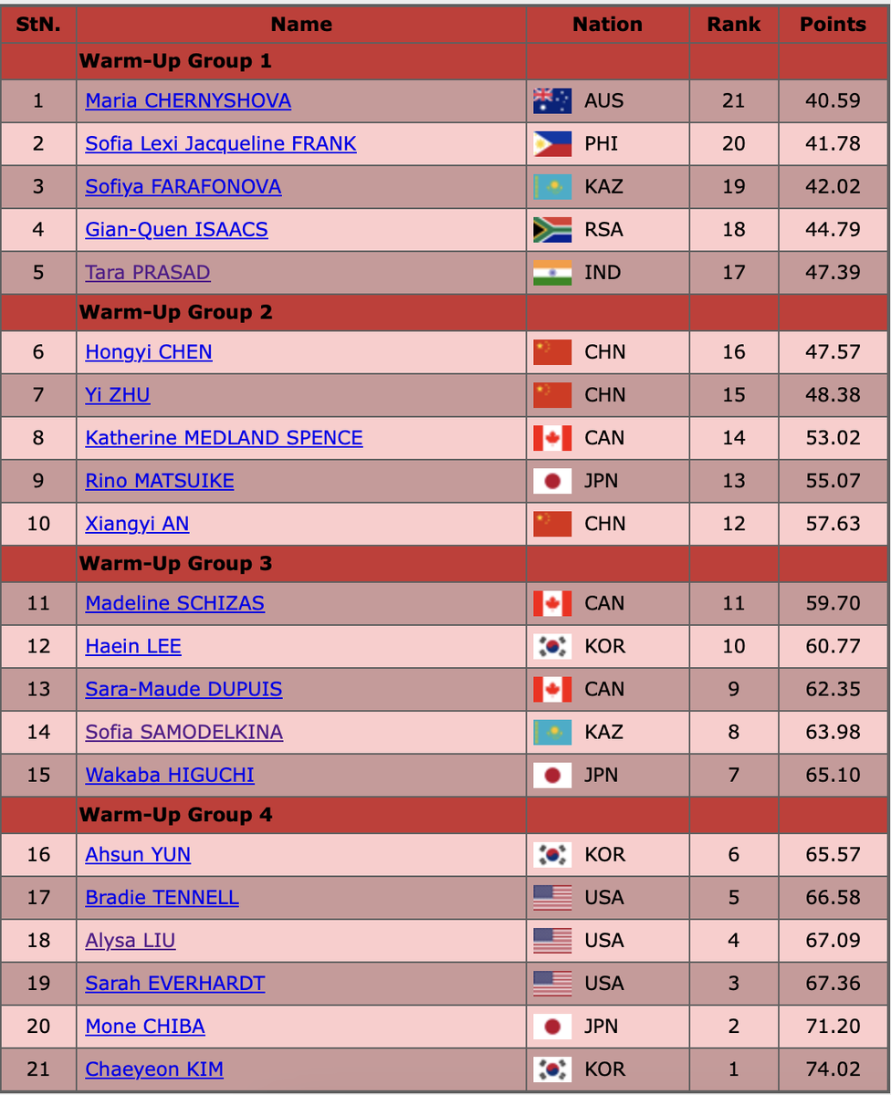 Список участниц в порядке выхода на лёд и баллы первого дня: