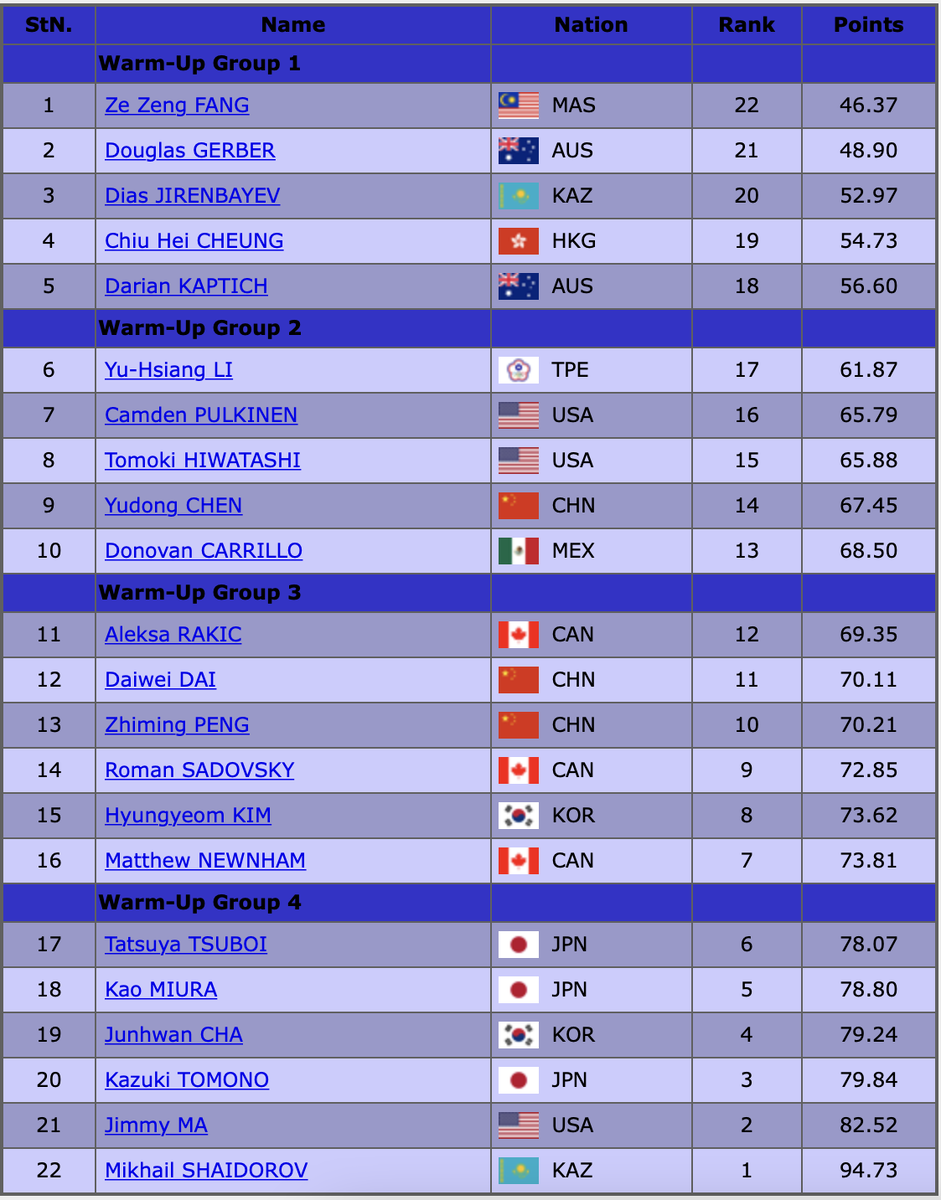 Баллы первого дня и порядок выхода спортсменов на лёд: