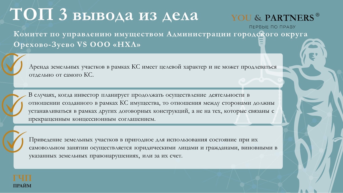 Команда You & Partners проанализировала решение суда первой инстанции по делу № А41-71036/24, где концедент обратился в суд к концессионеру с требованием после прекращения действия КС обязать освободить земельные участки от нестационнарных торговых объектов-павильонов и передать ЗУ свободными от имущества, не принадлежащего концеденту. Первая инстанция удовлетворила исковые требования в полном объеме и указала: 📌 Договоры аренды земельных участков носили целевой характер и должны быть прекращены вместе с действием КС, так как предоставление земли было связано исключительно с исполнением КС. Заключенные договоры аренды в отношении ЗУ носят целевой характер. 📌 Оснований для размещения объектов (торговых павильонов) в границах предоставленных участков нет, так как срок действия КС прекратился, при этом объекты не являются собственностью концедента. 📌 Размещение объектов, включая павильон быстрого питания, на территории земельных участков, предоставленных в рамках КС, является незако