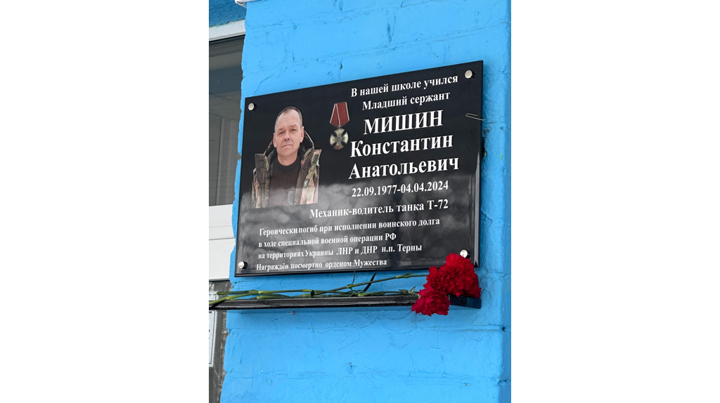 Во вторник, 18 февраля, на фасаде здания школы №49 в Брянске установили мемориальную доску в честь выпускника, кавалера ордена Мужества Константина Мишина. Он погиб в ходе проведения специальной военной операции. На церемонии открытия присутствовали супруга героя Наталья Сергеевна, а также две дочери Виолетта и Ксения, сестра Светлана Анатольевна, а также родственники, друзья, одноклассники, коллеги. Константин служил механиком-водителем танка Т-72 в звании младшего сержанта. Ветеран боевых действий, позывной «Филин», героически погиб