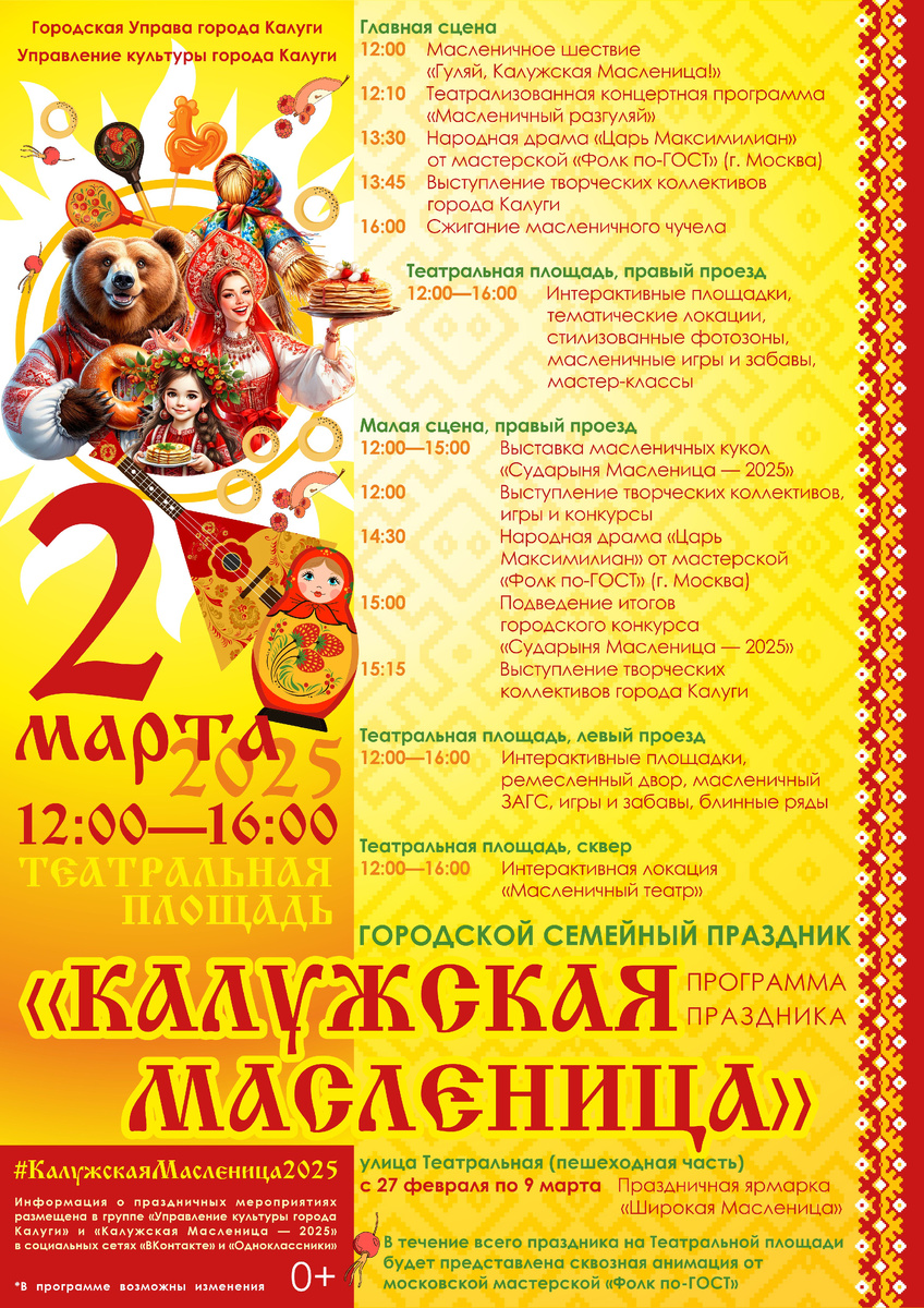 Цикл праздничных мероприятий в Калуге начнётся уже в это воскресенье. В домах культуры, библиотеках и детских школах искусств продут фольклорные и семейные праздники, театрализованные представления, масленичные посиделки. В микрорайонах города запланированы 24 мероприятия на открытых площадках. С 18 по 28 февраля Калужский дом мастеров приглашает гостей на масленичную неделю. Калужан угостят вкусными блинами по старинным рецептам и ароматным чаем из самовара на дровах, познакомят с купеческими традициями, масленичными обрядами, играми и забавами. С 27 февраля по 9 марта на пешеходной части улицы Театральной будет организована праздничная ярмарка с мастер-классами и подвижными играми. Любителей активного отдыха ждём 1 марта в 11:00 в городском парке культуры и отдыха на физкультурно-спортивный праздник. В программе: мастер-классы по видам спорта, весёлые старты, сдача нормативов комплекса ГТО и вручение знаков. В Калуге главной площадкой празднования Масленицы станет Театральная площадь