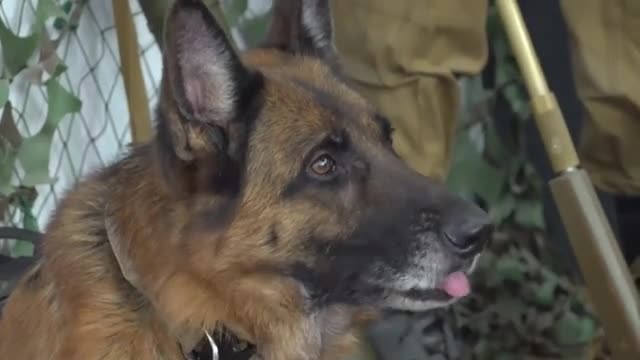 Немецкой овчарке по кличке Цезарь в июле исполнится 9 лет. Пес много лет добросовестно нес службу в составе инженерно-технического отдела ОМОН «Бастион». При его участии обследовано более 500 объектов городской инфраструктуры и 87 единиц автотранспорта. При этом обнаружено 11 взрывоопасных предметов и почти 4 тысячи патронов различного калибра. Цезарю вручили почетный знак «За отличие в службе служебной собаки» III степени. — Лапу дай,