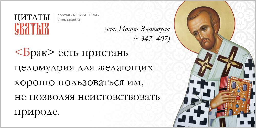 «Ничто у юношей не требует такого старания и забот, как целомудрие и чистота, потому что эта особенно страсть обуревает этот возраст. […] Будем удалять детей не только от зрелищ, но и от слушания соблазнительных и развратных песен, чтобы ими не прельстилась душа их. Не будем водить их в театры, на пиры и попойки. Но станем беречь юношей еще более, чем дев, скрываемых во внутренних покоях. Обыкновенно, ничто так не украшает юного возраста, как венец целомудрия, и то, чтобы вступать в брак чистому от всякого распутства. И жены будут им любезны, когда душа их наперед не узнает блуда и не будет растлена, когда юноша будет знать одну ту женщину, с которой он вступил в брак. Тогда и любовь бывает пламеннее, и расположение искреннее, и дружба надежнее, когда юноши вступают в брак с соблюдением этого».