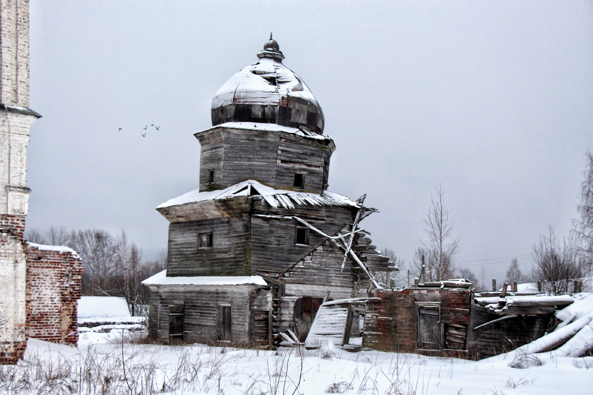 «А сегодня… смотрит на мир село Ухтома печальными глазами разоренных церквей. Крестовоздвиженская, Александра Невского, Успения Пресвятой Богородицы, да еще разрушенная часовня у реки. Как они были хороши когда-то, как сияли куполами и золотом иконостасов. Две церкви из них являются уникальными памятниками деревянного зодчества (Крестовоздвиженская и Александра Невского), их еще можно спасти, защитить от разрушительной силы дождя, ветра, снега. Кто же откликнется на зов о помощи, кто поможет реальным делом? Ответа нет.» Начать пост про Ухтомские церкви хочется с цитаты Г.Державиной (журнал «У истоков» (выпуск №4, 2005 г.) Село Ухтома встретило меня холодным январским днем. Незадолго при подъезде до того, как отчетливо станут видны очертания села, я заметила высившуюся разрушенную колокольню Успенской церкви над крышами домов. За небольшой дорожной развилкой находилась первая цель моего Вологодского путешествия. Храмовый комплекс включал в себя заброшенные и разрушенные церкви- Успе