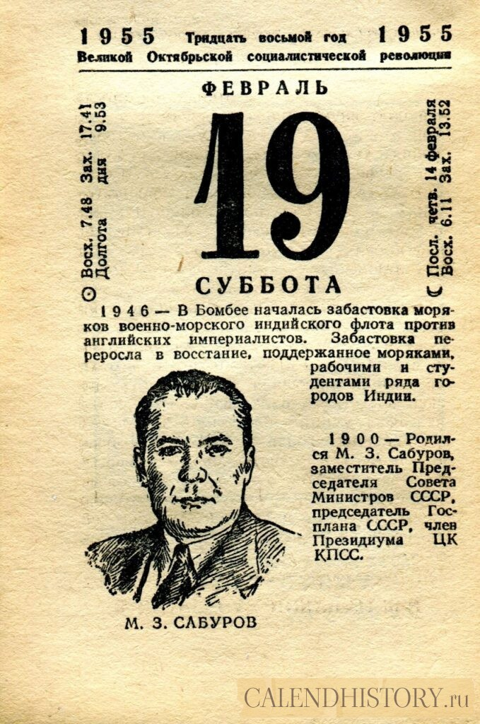 Итак, сегодня 19-го февраля и у нас на календаре 1955-й год. Перед нами листок советского календаря Политиздата. На календаре у нас суббота - 19 февраля 1955-го года. М. 3. САБУРОВ 1946 — В Бомбее началась забастовка моряков военно-морского индийского флота против английских империалистов. Забастовка переросла в восстание, поддержанное моряками, рабочими и студентами ряда городов Индии. 1900 — Родился М. 3. Сабуров, заместитель Председателя Совета Министров СССР, председатель Госплана СССР, член Президиума ЦК КПСС. *** Оборотную сторону листка этого календаря можно посмотреть у нас по ссылке на сайте. Другие листки советских календарей смотрите у нас на сайте - CALENDHISTORY.ru ПОСМОТРИТЕ ЕЩЁ ЛИСТКИ ОТРЫВНЫХ КАЛЕНДАРЕЙ:
