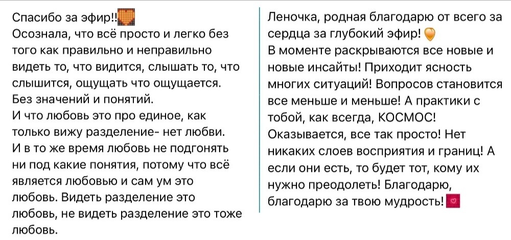 Деньги просто есть. Всегда. Без каких-либо причин. Как это ясно увидеть? Ключ – в видео⬇️ После каждой онлайн-сессии участники тренингов присылают свои осознавания. Вот так наглядно происходит сдвиг восприятия⬇️ 🌟 Два ближайших онлайн-процесса, в которые можно зайти сейчас: 1️⃣ Онлайн-формат «Присутствие» тренинга-путешествия «Точка сборки в Тайланде-Камбоджи. Длительность: 10 дней, 24 февраля – 05 марта. Это самодостаточный, всегда глубокий и мощный процесс: ✔️ 6 получасовых эфиров с осознаниями. ✔️ Чат участников, обмен осознаваниями, непрерывный процесс раскрытия Ясности. ✔️ Ответы на ваши вопросы. ✔️ Тезисы дня: можно использовать как ключ, исследовать это самостоятельно. ✔️ Видео и подкасты с тренинга. Чат со всеми материалами остаётся у вас. ⚡Присоединяйтесь, чат уже открыт, процесс запущен⬇️ Онлайн-формат «Присутствие» 2️⃣ Онлайн-тренинг «Точка сборки». Длительность: 2 недели, с 12 по 27 марта. Фундаментальный процесс, который расставит на места то, что раскротся в Тайланде/Ка