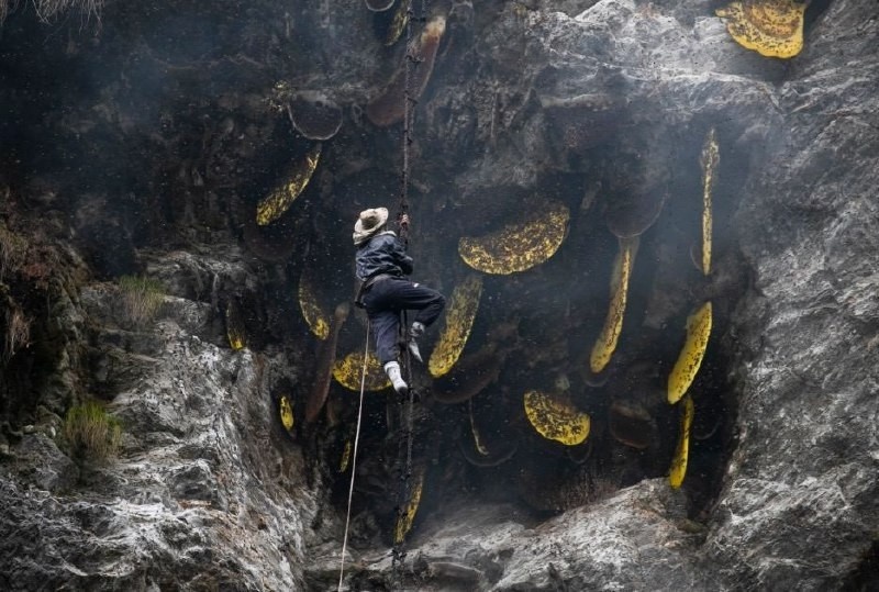 Охотники за медом — это не просто люди, а настоящие акробаты, умеющие работать с опасными инструментами и материалами, находясь в крайне неудобных и рискованных условиях. Нам предстоит восхождение на эти опасные скалы, высота которых составляет сотни метров. Словно черви, ползущие по узким тропкам, охотники поднимаются на эту высоту, часто теряя много крови от укусов гигантских пчел, чьи жала способны пробить даже плотную одежду. Это не просто труд — это борьба за выживание, и каждый неправильный шаг может стать последним.