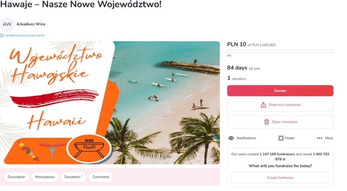 В Сети, преимущественно русскоязычных СМИ, завирусилась новость, что в Польше некий Аркадиуш Вица (Arkadiusz Wica) открыл на краудфандинговой платформе zrzutka.pl сбор средств на «покупку Гавайских островов», вдохновившись заявлениями Дональда Трампа о желании приобрести Гренландию. В первую очередь, нужно отметить, что такой сбор действительно существует, в чём убедился и журналист Telegraf.news. При этом инициатива носит явно шуточный характер: организатор предложил включить Гавайи в состав Польши на правах 17-го воеводства. Цель сбора — 1 миллион злотых (около 250 тысяч долларов), что, по мнению автора, должно хватить на покупку островов. «Польша уже когда-то простиралась от моря до моря — сейчас мы возвращаемся к этой традиции!» — заявил Вица в описании к сбору. На странице сбора средств также перечислены шуточные предложения по «реполонизации» Гавайев: расставить на пляжах характерные для Польши заграждения от ветра, продавать «гавайскую колбасу» за злотые и назвать набережную в Г