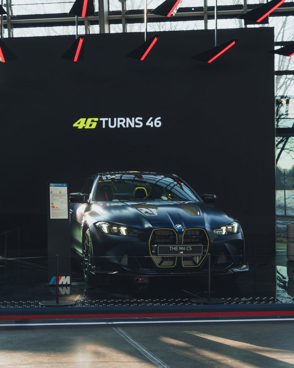 На боковинах можно увидеть огромную цифру «46», выполненную в более светлом оттенке синего. При этом интересным моментом является отсутствие на этом M4 CS жёлтых дневных ходовых огней. BMW решила заменить их обычными белыми светодиодами. Красные акценты, которые обычно присутствуют на моделях Competition Sport, на этом автомобиле отсутствуют. Зато тормозные суппорты, как и полагается автомобилю Росси, окрашены в яркий флуоресцентно-жёлтый цвет. В общем, все характерные для BMW элементы, как открытые детали кузова из углеродного волокна и лазерные задние фонари, на месте, но с уникальными акцентами для этой особой версии.