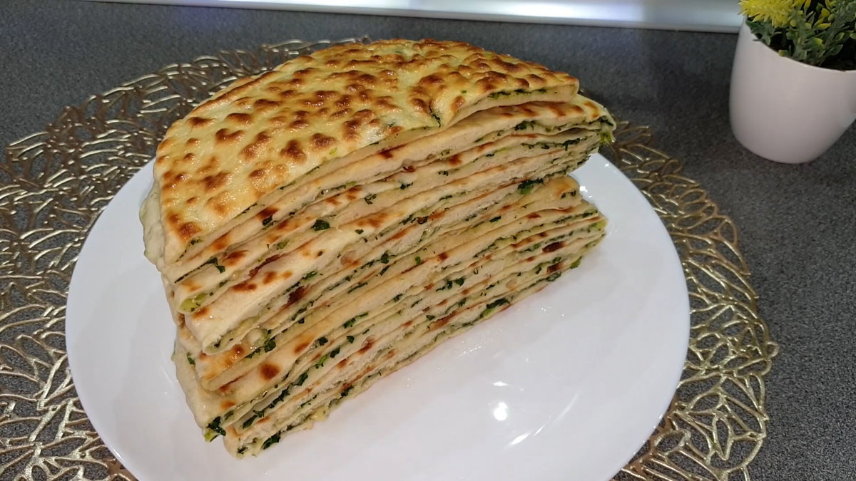 Всем привет! Сегодня готовлю вкусное блюдо, которое может быть с разными начинками. Тёплый кефир (обязательно!) 3.2% жирности- 300 мл, я подогрела до 30С. Наливаю в большую ёмкость. Соль - 1 чайная ложка без горочки. Сода пищевая - 1 чайная ложка без горочки. Всё перемешиваю, сода вступает в реакцию с кефиром - появляются пузырьки. 400 грамм муки пшеничной высшего сорта просеиваю. Так как мука разных производителей отличается, ориентируйтесь на консистенцию теста как в видео. После ввода всей муки, оно такое. Мгновенно становится таким, оно мягкое и не липнет к рукам. Обмазываю тесто растительным маслом и кладу в чистый сухой пакет. Плотно закрываю пакет и оставляю полежать в комнате без сквозняков 30 минут. По несколько веточек лук, укроп, петрушку. Стебли я срезала, потому что они будут рвать тесто. Мелко нарезаю зелень. Можете брать ту зелень, которая вам нравится. Такие лепешки я готовила с разными начинками - мне очень нравятся. Например, зелень с обжаренным до полной готовности