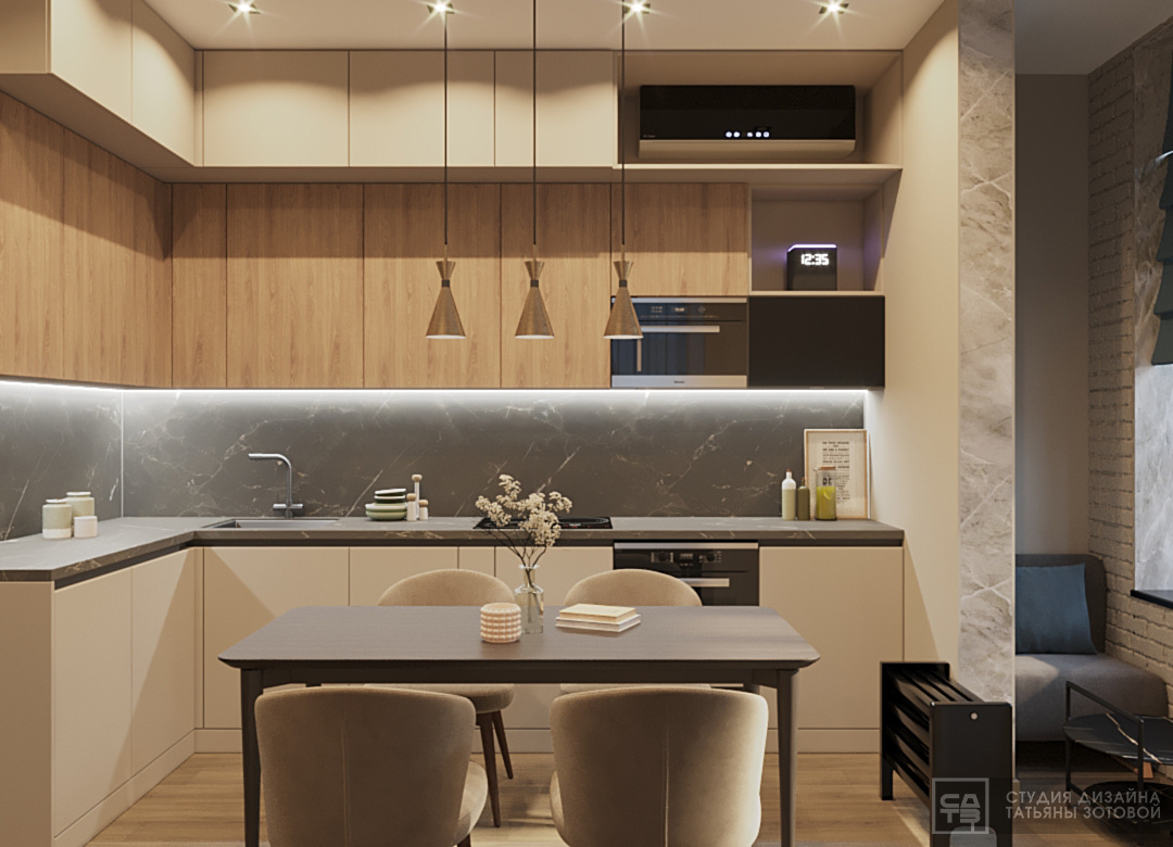Изначально планировка квартиры имеет очень удачное расположение. Из этой квартиры можно сделать : В нашем случае, стояла задача сделать квартиру для комфортного проживания двух семей. Чтобы у каждой семьи была своя приватная зона: свой санузел, комната и своя кухня. Мы предложили квартиру можно условно разделить на 2 независимые зоны. Объединяет 2 зоны прихожая. В прихожей достаточно места для размещения верхней одежды и удобная банкетка. В первую зону нас ведет дверь со стеклянными блоками сверху. На кухне мы разместили всю необходимую технику: посудомоечную машину, стиральную машину, духовой шкаф. СВЧ и ТВ встроили в верхние шкафы, для экономии пространства. Сразу из кухни-гостиной попадаем в комнату. Для того, чтобы хозяева себя чувствовали максимально комфортно, мы предложили использовать мебель-трансформер. Для встреч гостей комната преобразуется в гостиную с вместительным диваном. А вечером диван легким движением руки превращается в полноценную двуспальную кровать. Санузел и д