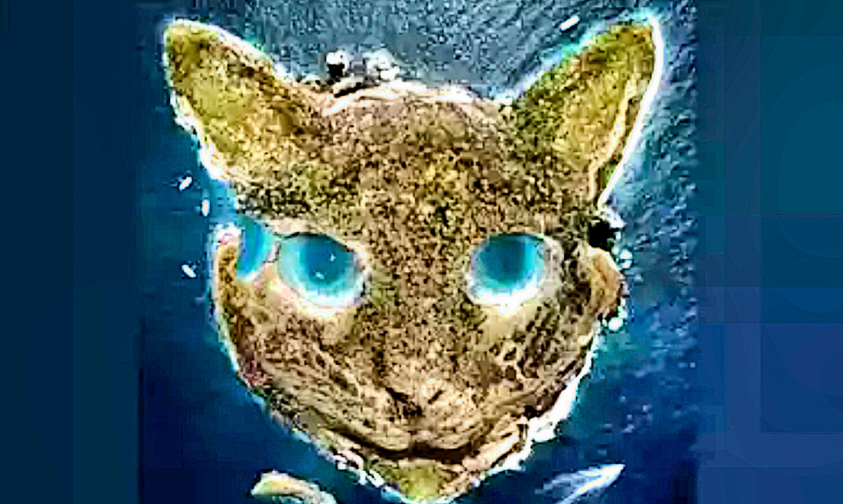 Тропический остров, окружённый большим голубым морем, покрыт пышной зеленью и скалистыми выступами. У него удивительные ярко-голубые глаза, из-за которых он похож на крутого, необычного котёнка, который смотрит прямо на вас. Поблизости даже плавает несколько маленьких лодочек, что даёт вам представление о том, насколько огромен этот остров в форме кота.