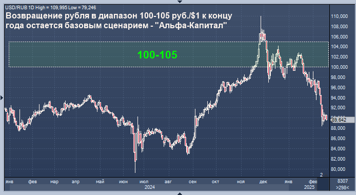 Возвращение рубля в диапазон 100-105 руб./$1 к концу года пока остается базовым сценарием, говорится в аналитическом материале "Альфа-Капитала".