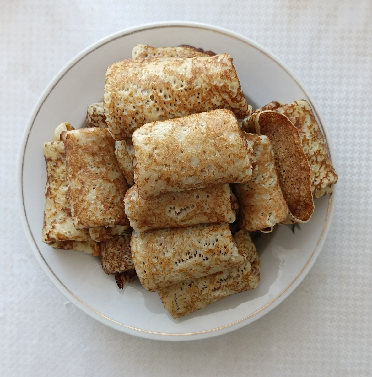 Моим первым блюдом, которое я научился готовить, были блины и было мне тогда лет двадцать. Нет, до этого я мог приготовить что нибудь попроще, макароны сварить например или яичницу пожарить, но блины ещë не готовил. Мы тогда жили в деревне и что то мне так захотелось блинов, а желающих их приготовить не было. Ну что делать - молоко есть, яйца свои - ну то есть куриные, а то не так ещë подумаете. Всë по памяти, доступного интернета ещë тогда не было, а я как то привык, всë сам делать. Замешал тесто, разогрел сковородку и давай, работай конвеер, только успевай в стопку складывать и смазывать маслом. Стопка та, надо сказать, получилась внушительной - ну не умею я готовить малыми дозами и на удивление, с первого раза, не плохо получилось. Вот с того раза, в нашей семье, я стал главным по блинам. Никто, кроме меня, их уже не делал, но съедали с удовольствием все. Но что ещë удивительно, тогда не было даже никаких приспособлений, облегчающие приготовление блинов как сейчас. Самая о