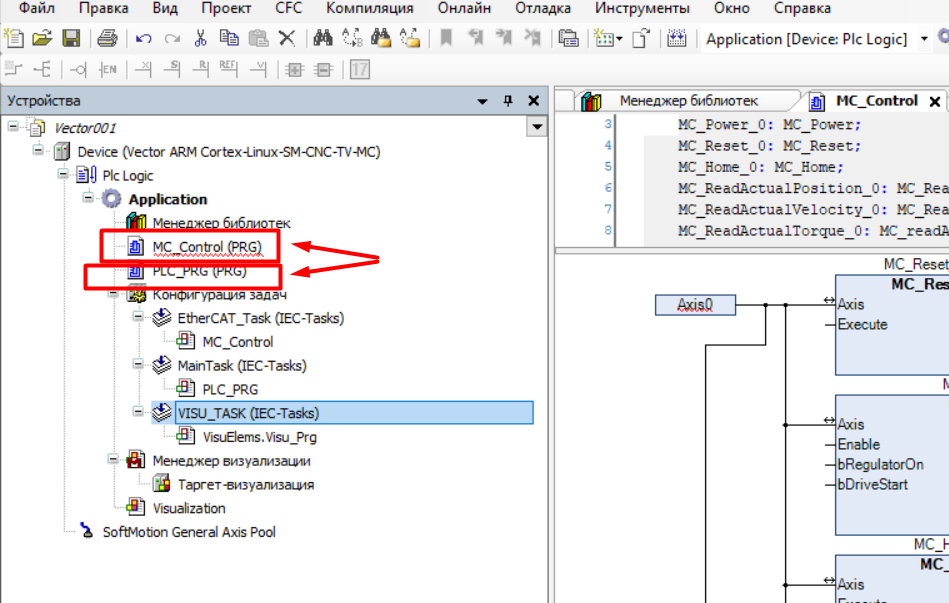 Для различных точных систем, где требуется позиционирование рабочего элемента, манипуляторов и роботов существуют специальные готовые решения. И одно из них это PAC-ПЛК с CoDeSyS на борту. Приветствую всех читателей, с вами на связи автор блога, Семен. Эта статья будет посвящена готовой библиотеке под названием Soft Motion в дистрибутиве CoDeSyS. Как обычно стараюсь писать по существу, без всякой воды. Если есть вопросы\предложения\жалобы можете писать в телеграмм "Ты же инженер АСУ ТП". Вторая часть Soft Motion. Эта статья будет посвящена подключению Сервопривода по EtherCAT. Создаем две программы. отдельно для основных задач, отдельно для задач управления Осями. После этого добавляем новое устройство EtherCAT. Лучше добавить той версии, в которой создан ваш проект. В задачу нужно переместить вашу программу. После этого выбираем MAC внешней шины EtherCAT. Добавляем устройство Сервопривода. Добавляем Ось Axis. Можно создать визуализацию, и на ней перекинуть базовые блоки Soft Motion.