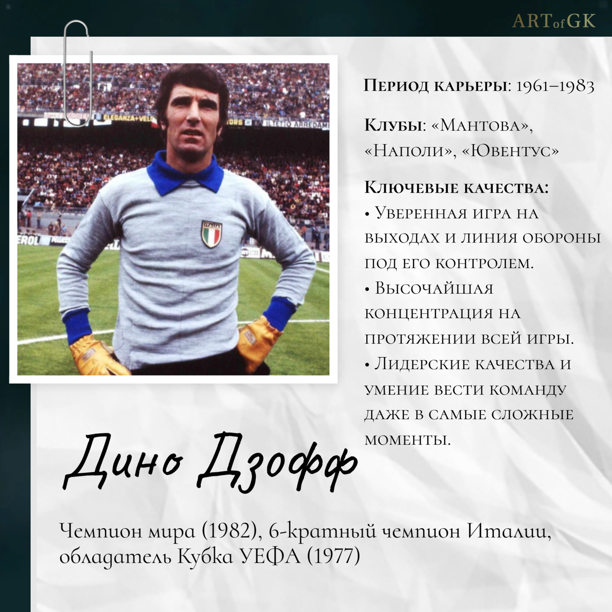 Когда говорят о великих вратарях в истории футбола, имя Дино Дзоффа неизменно стоит в первых рядах. Его карьера – это пример невероятной стабильности, профессионализма и стойкости. Дзофф стал символом итальянской школы вратарей и оставил неизгладимый след в мировом футболе. Дино Дзофф родился 28 февраля 1942 года в небольшом итальянском городе Мариано-дель-Фриули. В детстве он мечтал стать автогонщиком, но судьба распорядилась иначе. Его путь к вершине был не таким быстрым, как у современных звёзд. В юности Дзофф не выделялся особыми физическими данными – его даже отсеяли на просмотре в «Интере» и «Ювентусе» из-за недостаточного роста. Однако настойчивость и трудолюбие взяли верх: он не сдавался и продолжал заниматься футболом, постепенно превращаясь в надёжного и уверенного голкипера. • «Удинезе» (1961–1963) Профессиональная карьера Дзоффа началась в «Удинезе», где он дебютировал в Серии A в возрасте 19 лет. Его команда боролась за выживание, но талант молодого вратаря не остался неза