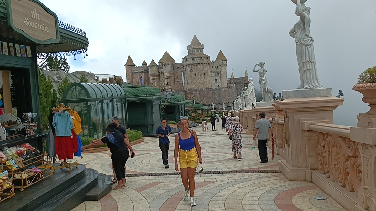 После отдыха на пивном заводике мы ещё погуляли по французской деревне!Место это настолько атмосферное,что уходить не хотелось! Опять же,если вы спуститесь на второй уровень,к Золотому мосту и вдруг снова захотите поглулять по деревне,то можете снова сюда подняться! Мы же решили погулять тут по полной программе среди замков и скульптур!Время от времени налетали облака и мы гуляли в них!Место становилось ещё загадочней!И при этом было тепло! Сколько здесь мест для фото,невероятное количество!А ещё тут есть павильоны с атракционами,башней свободного падения и игровыми автоматами.Есть тут и музей восковых фигур, в общем очень много интересного! Также за отдельную плату можно прокатиться в санях по альпийским горкам! А мы решили по второму разу завернуть на заводик.А почему бы ещё не выпить вкусного освежающего пива?К тому же опять можно поучаствовать в весёлом конкурсе!И опять каждый из нас пролез в свой размер.Сергей правда осмелился пролезть в литр,но застрял!Потом мы сидели и вс