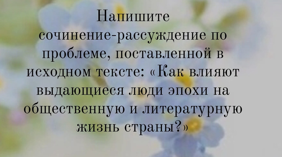 Задание: Напишите сочинение-рассуждение по проблеме, поставленной в исходном тексте: «Как влияют выдающиеся люди эпохи на общественную и литературную жизнь страны?»