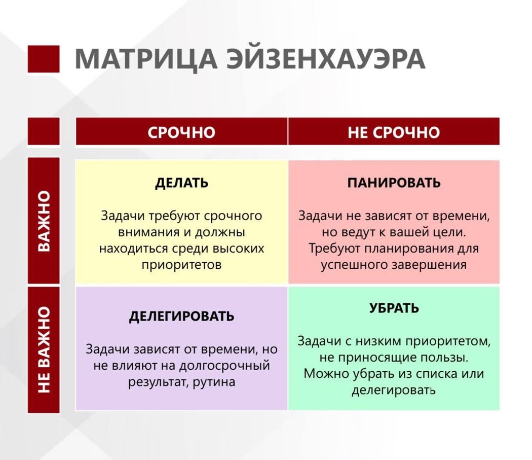 Лично я часто использую матрицу Эйзенхауэра и руководствуюсь следующими рекомендациями при ее заполнении: