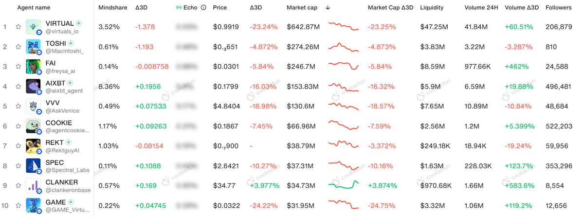 Когда Deepseek и Grok3 продолжали набирать популярность в мире Web2, экосистема AI в Web3 столкнулась с историческим падением, и многие AI-токены откатились по меньшей мере на 80% от высоких значений месяц назад, среди которых экосистема Virtual Protocol (VIRTUAL) также испытала резкий спад — токен платформы VIRTUAL упал за день на 8,6%, а токены, выведенные из инкубатора, такие как GAME и LUNA, упали более чем на 10%.