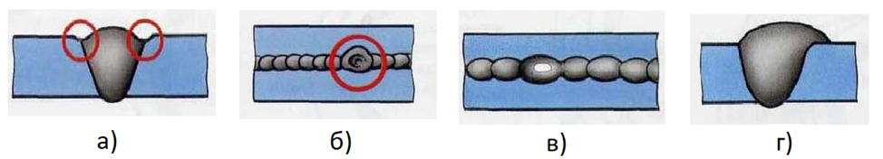 Непровар (рис.3, а) – это местное несплавление в сварном шве из-за неполного расплавления кромок. Непровары возникают из-за загрязнения кромок, завышенной скорости сварки, недостаточного сварочного тока. Поры (рис.3, б) – это полости округлой формы в сварном шве, шлаковые включения (рис.3, в) – небольшие объемы, заполненные неметаллическими веществами (шлаками, оксидами). Шлаковые включения могут появиться при заполнении сварочным шлаком непроваров и подрезов, или в случае некачественной очистки предыдущего слоя от шлаковой корки. Также поры и шлак появляются при завышенной скорости сварки.