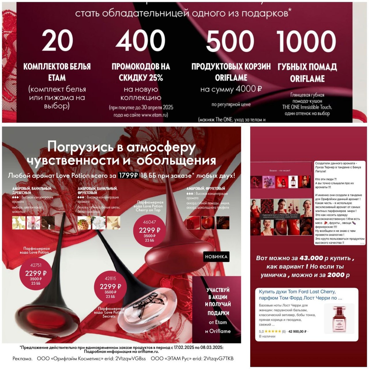 Представляешь? *за 2 000 р. вместо 43 000* Зачем платить больше, если новый аромат Love Potion Cherry on Top создан тем же парфюмером, что и легендарный аромат Том Форд? И имеет те же ноты 🍒 Новинка - просто крышесносная🔥 А если брать любые 2 аромата Love Potion, то цена вообще 1799 р. Причем при покупке любого *автоматически участвуешь в розыгрыше* нижнего белья, купонов на скидку, корзины с косметикой и 💄 И вот весь каталог. Он до 8.03. https://www.oriflame.ru/products/digital-catalogue-current?pageNumber=1 Для заказа пишите в личку ✍