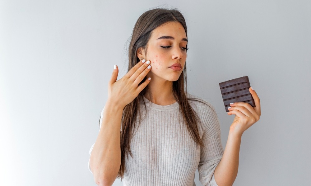 Употребление шоколада уже давно связывают с появлением прыщей. С 1969 года он считается одной из причин, вызывающих акне, однако есть ряд исследований, которые показали, что прямой связи между плитками шоколада и высыпаниями на коже нет. Все дело в том, что шоколад, шоколадные батончики и конфеты содержат не только какао. В основном в их составе большое количество сахара, который, как доказано, вызывает появление прыщей. В некоторых конфетах и батончиках сахара больше, чем какао, а это может быть основной причиной появления прыщей.