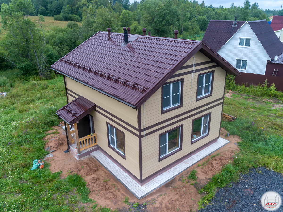 Итак, перед нами 2-этажный каркасный дом на фундаменте УШП, с уже готовым фасадом. Фото сделано в июле 2019 года. Предлагаю сперва посмотреть краткую историю строительства, а потом уже изучить результат.