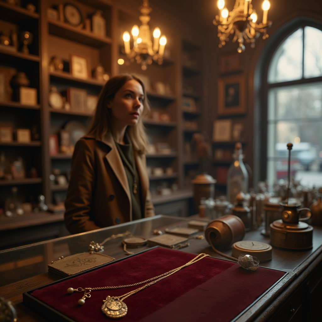 Колокольчик над дверью мелодично звякнул. Тёплый воздух окутал её, принося с собой запах старого дерева, пыльных книг и ещё чего-то неуловимо знакомого. Полина медленно двигалась между стеллажами, разглядывая антикварные безделушки, пока не остановилась у витрины с украшениями.