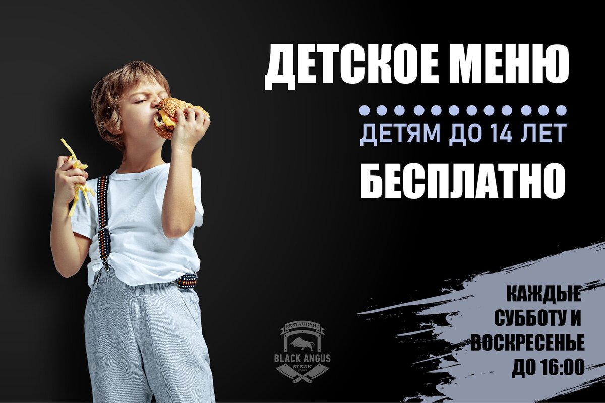 - Стейк-Хаус Black Angus — Детское меню бесплатно детям до 14 лет только по выходным до 16 часов.