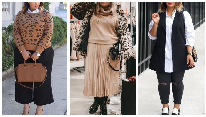 Белая рубашка + леопардовый свитер + укороченные черные брюки широкого фасона + остроносые нюдовые туфли-лодочки — аутфит, который непременно стоит повторить дамам plus size.