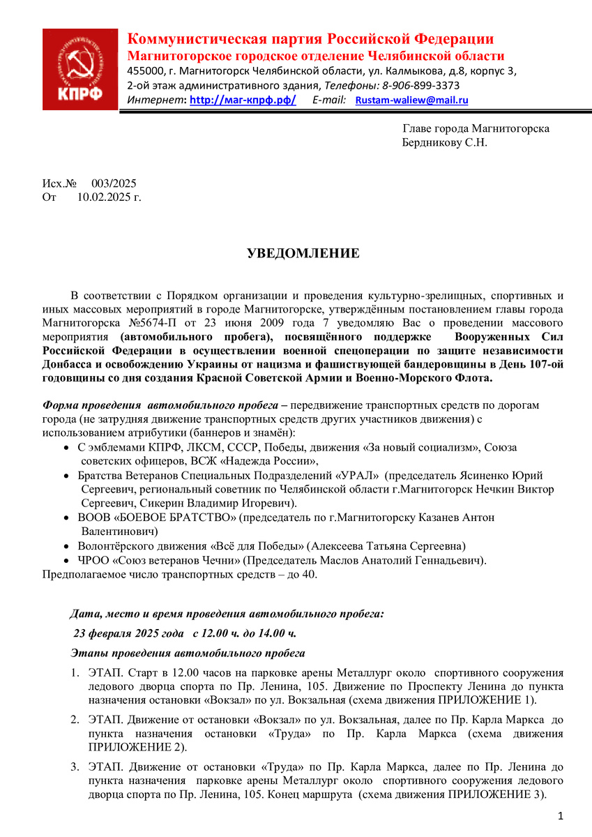 Магнитогорские власти отказали коммунистам в проведении патриотического автопробега, запланированного на 23 февраля 2025 года, посвящённого поддержке Вооруженных Сил Российской Федерации в осуществлении военной спецоперации по защите независимости Донбасса и освобождению Украины от нацизма и фашиствующей бандеровщины в День 107-ой годовщины со дня создания Красной Советской Армии и Военно-Морского Флота, ссылаясь якобы на то что в том же самом месте, в то же самое время запланирован другой автопробег, по некоторой информации, организованный властью и «Единой России» и посвященный «Дню защитника Отечества», якобы уведомление на мероприятие «Единой России» было подано раньше. Первый секретарь МГК КПРФ Рустам Валиев, совместно с представителями организаций ветеранов, 11 февраля 2025 года подал уведомление на проведение культурно-массового мероприятия, автопробега, в поддержку СВО и 107-ой годовщины со дня создания Красной Советской Армии и Военно-Морского Флота. В уведомлении, планировало
