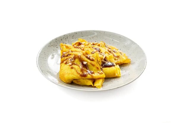 Некоторые блины и так имеют золотистый оттенок, но у этого образца все же откровенно желтый цвет, которого мы добились, отправив в тесто куркуму. К таким блинам мы придумали десертную начинку — банан с арахисом и карамельным соусом. Ингредиенты Куриное яйцо 2 штуки Вода 1 стакан Молоко 1 стакан Пшеничная мука 1 стакан Растительное масло 2 столовые ложки Куркума 1 чайная ложка Соль ½ чайные ложки Сливочное масло по вкусу Бананы 5 штук Жареный арахис 100 г Карамельный соус 100 мл 1.Подготовить все ингредиенты. Стакан воды довести до кипения. 2.Миксером взбить яйца с солью и куркумой до пены. Влить кипяток, продолжая взбивать яйца. 3.Не останавливая миксер, влить холодное молоко. Затем вмешать просеянную муку. 4.В конце вмешать в тесто растительное масло и отправить его в холодильник на 20–30 минут. 5.Бананы размять вилкой. 6.Арахис некрупно порубить. 7.Хорошо разогреть блинную сковороду, при желании смазать ее небольшим количеством растительного масла и влить половник теста, распреде