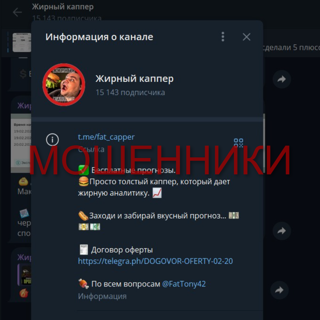Телеграм-канал «Жирный Каппер» обещает стабильную прибыль на ставках, гарантируя высокую проходимость прогнозов. На первый взгляд, проект выглядит привлекательно: регулярные публикации, уверенная подача, наличие статистики. Однако при детальном анализе выявляются серьёзные несоответствия, которые ставят под сомнение честность каппера. Разберёмся, можно ли доверять его прогнозам или это очередной способ обмана? Жирный Каппер ведёт Telegram-канал, где предлагает: На первый взгляд всё выглядит профессионально, но при детальном анализе возникают тревожные признаки. Несмотря на наличие положительных комментариев, большинство выглядят подозрительно. 🔴 Реальные жалобы пользователей: Жирный Каппер выглядит сомнительно и обладает всеми признаками мошеннического проекта. ✅ Рекомендация: не доверяйте этому проекту. Если ищете надёжные прогнозы, выбирайте сервисы с открытой статистикой и подтверждёнными результатами.