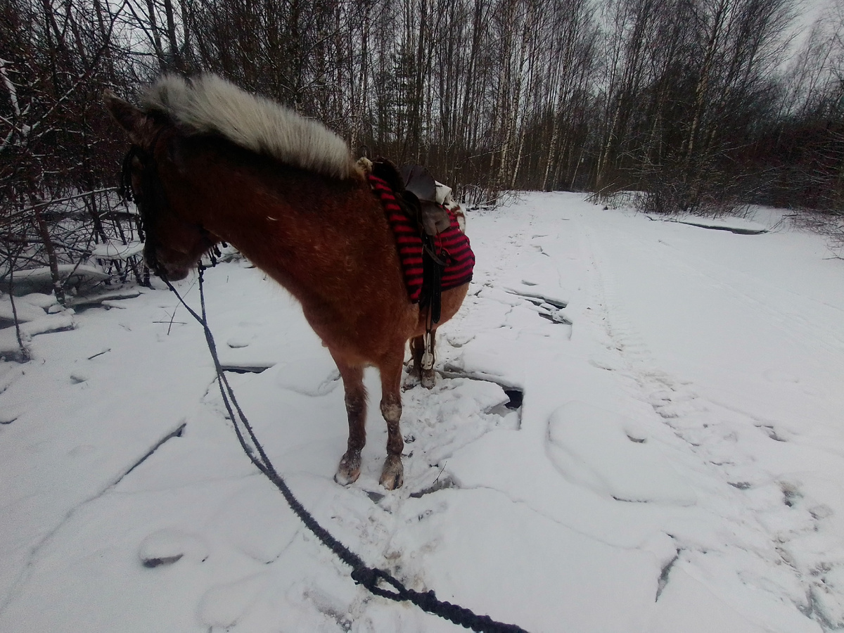 А у нас тут такое!😄 Внезапно... Внезапно сразу всё. Внезапно оказалось, что нужно срочно оплачивать интернет, а для этого внезапно нужно срочно идти на почту - благо можно перейти на Большую Землю по льду на просеке под линией электропередач. Ну, думаю, хорошо, заодно куплю по мелочи - сахар, масло растительное - и ещё раз вьючных козлов в село выгуляю, молодому пегому Жану это на пользу. Приготовила уже перед домом козлиные сёдла, и тут внезапно мимо идёт с саночками на рыбалку поселенец из соседней деревни, говорит - вездеход опять лёд в ручье проломил, а там уже и воды нет, лёд на земле лежит. Я радостно побежала седлать Лакушу - если она там сможет пройти, так на ней поеду, а не сможет - вернусь за козлами, время позволяет. В общем, у козлов наметился отпуск😃 Неудобно, конечно, по шатким льдинам лошади идти, но потихоньку перешла. Снегом немножко лёд забьётся, к дну примёрзнет - будет хорошая дорога до самого весеннего потепления Если считать от начала морозов - вода ушла очень